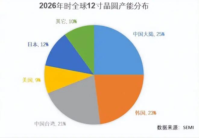 重点来了,中国大陆到2026年时,月产能预计会达到240万片每月,占全球总产能的比例为25%,全球第一。