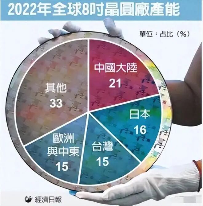 中国大陆于2018年开始,在8寸晶圆产能上,就一直保持着全球第一,2022年时,中国大陆8寸晶圆的产能占全球产能比例给为21%,而第二名是日本,占16%。再是中国台湾、欧洲及中东。