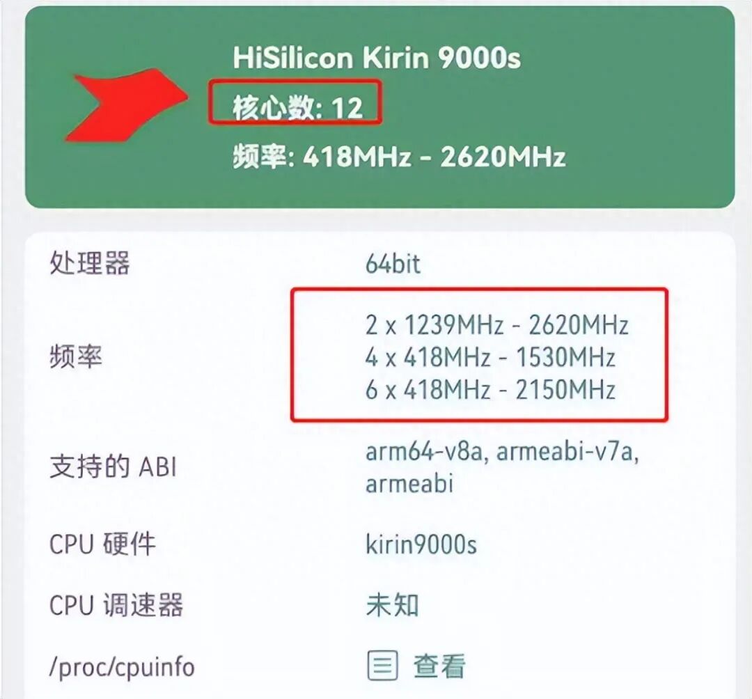 我们知道,麒麟9000S是采用三簇设计,8个CPU,分别是1 个2.62GHz超大核+3个2.15GHz大核+4个1.53GHz小核组成。