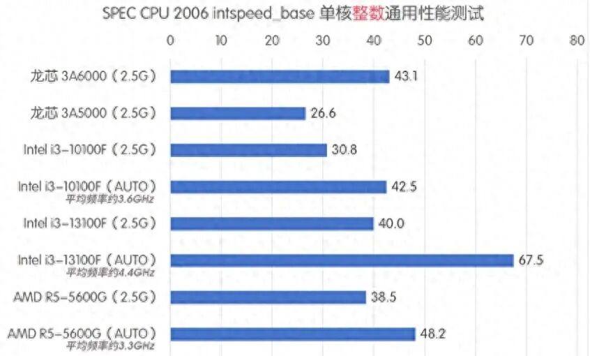 对比来看,龙芯3A6000的单核追上i3--10100F,而在2.5G频率下,追上i3-13100F。而在多核情况下,龙芯3A6000与i3-10100F相比,也不相上下。