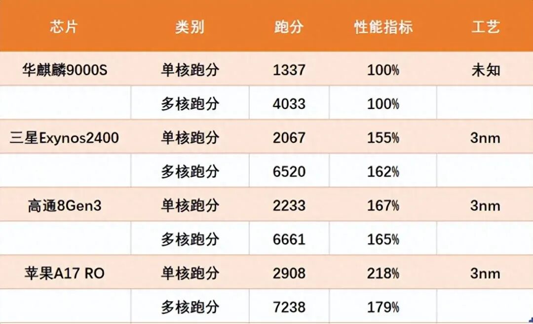 这4款处理器中,苹果A17、三星Exynos2400、高通骁龙8Gen3都是3nm芯片,而华为麒麟9000S的工艺未知,有人说是14nm,也有人说是7nm,还有人说是5nm,暂且不管工艺,我们以麒麟9000S的性能为100%,看看另外三款芯片的性能会高多少,看看差距吧。