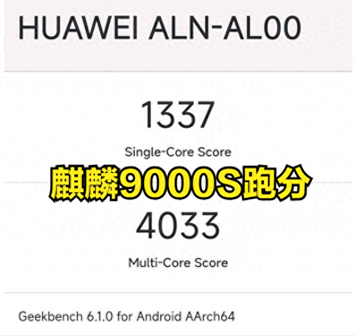 接着看华为麒麟9000S,同样是geekebench6的跑分成绩,单核为1337分,而多核为4033分。这个成绩,比高通、三星的跑分低不少。