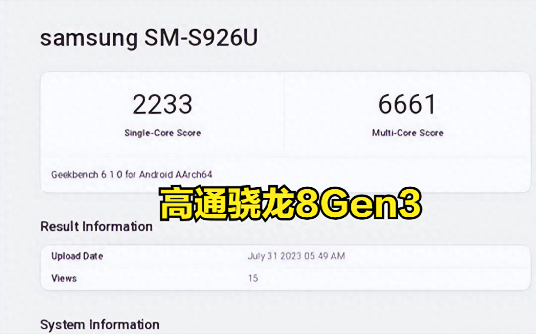 接着来看,高通最新的芯片骁龙8Gen3,这颗芯片也没发布,但其跑分已经流出来,也是三星S24某些版本采用的芯片。