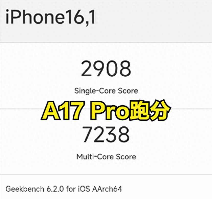 最后,我们再放上苹果A17 Pro的geekebench6的跑分成绩进行对比,geekebench6的跑分成绩是单核2908分,多核是7238分。