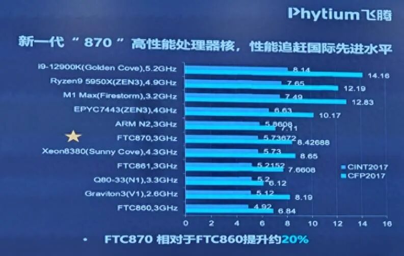如上图所示,可以看到,FT870内核,与N2,3GHz水准差不多,超过N1,真正实现了全球领先水平。