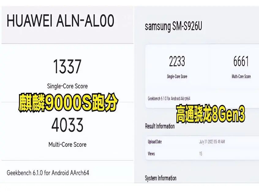 按照geekebench6的跑分成绩,其中麒麟9000S的单核为1337分,而多核为4033分。而之前三星手机搭载的高通骁龙8Gen3在数据库中的跑分为,单核2233分,多核6661分。