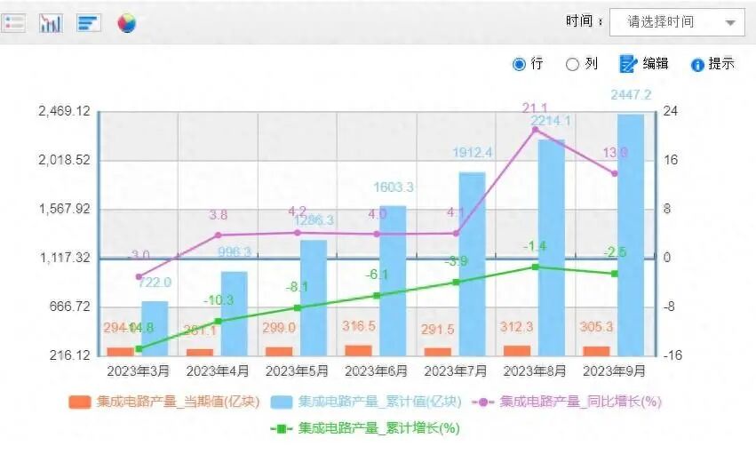 数据显示,9月份国内集成电路的产量是305.3亿块,同比增长13.9%,而截止至9月份,今年一共生产集成电路2447.2亿块,累计同比下滑2.5%。