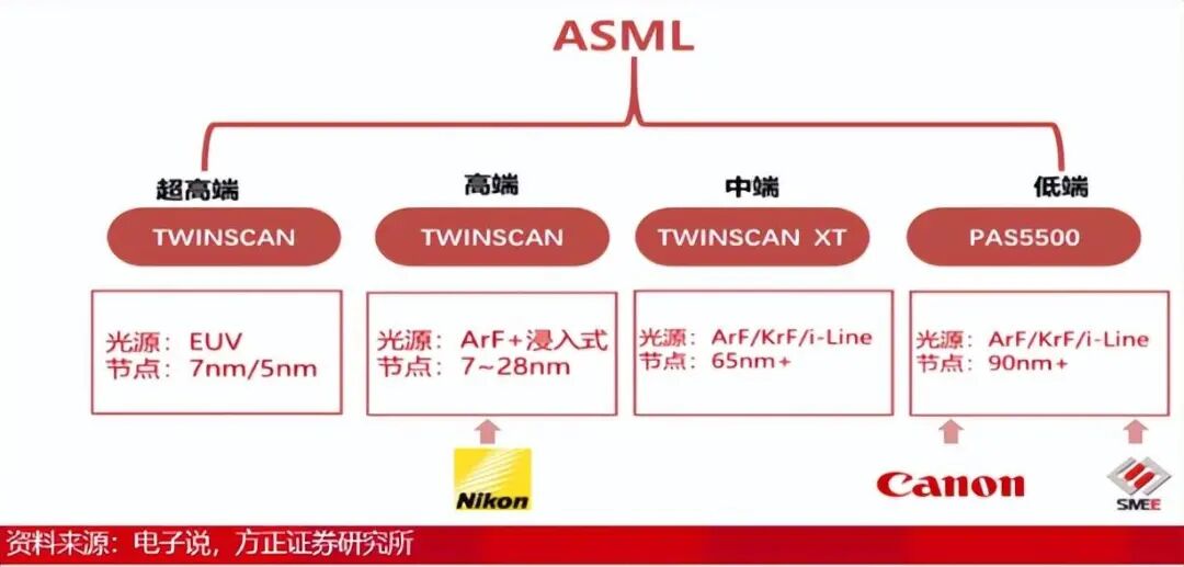 而除了ASML之外,日本还有尼康、佳能,中国大陆还有上海微电子,这三家企业相对于ASML,不管是技术水平,还是市场份额,确实低很多。