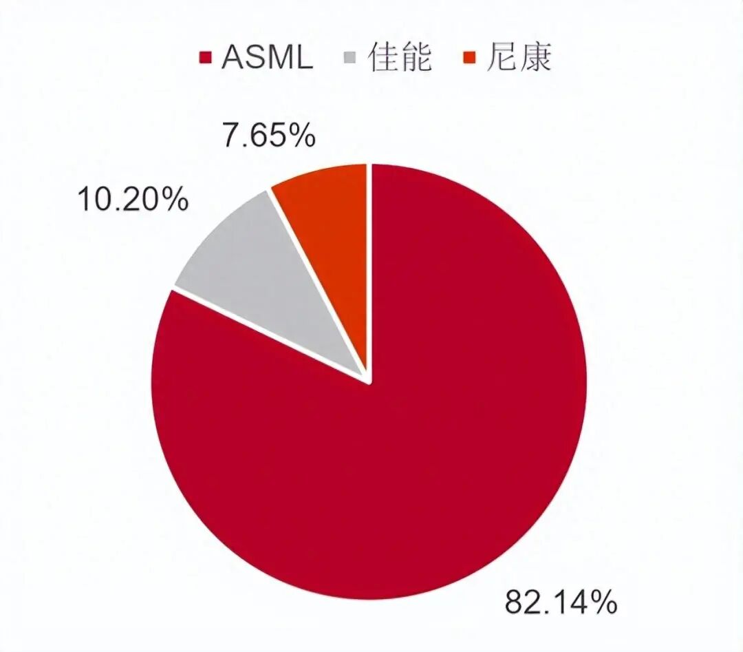 如下图所示,这是三家厂商在光刻机领域领域的市场份额情况,ASML一家就独占80%+份额。