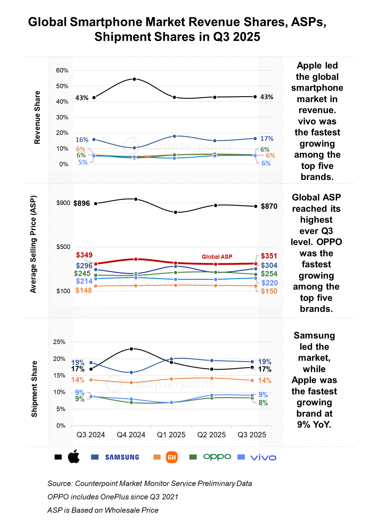 另外,该机构表示,在排名前五的OEM厂商中, OPPO的平均售价增幅最高,同比增长3.4%,同时营收增长1%。Reno 14系列的强劲表现推动了销量增长,而高端产品线的扩张则促进了平均售价的增长。vivo在排名前五的品牌中营收增长最快,同比增长12%,这主要得益于印度、东南亚以及中东和非洲等地区的强劲出货量增长。(校对/李梅)