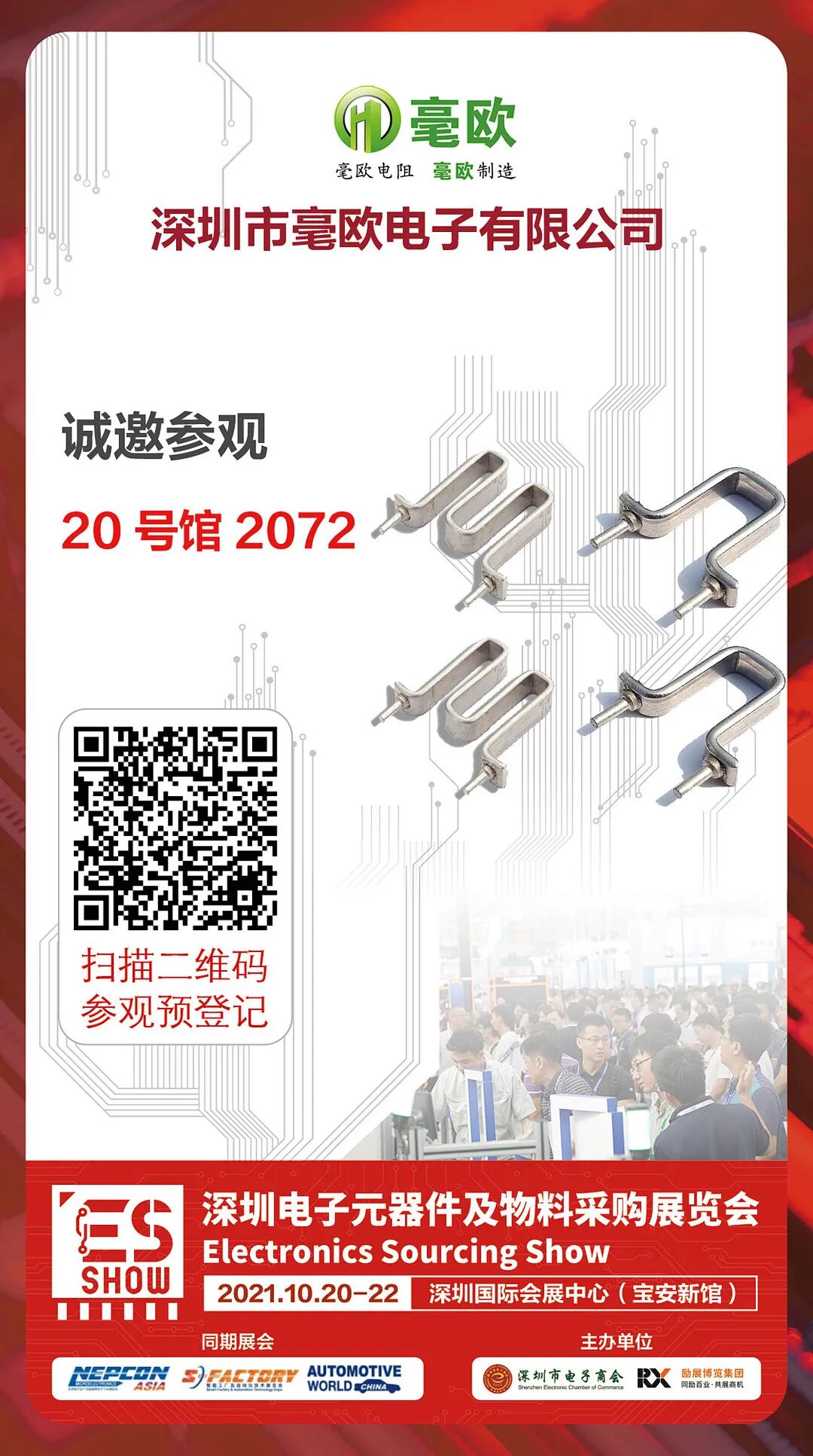 深圳市毫欧电子有限公司 毫欧电子公司成立于2008年,2009年注册成立深圳市毫欧电子有限公司,是一家国家级高新科技企业。2012年通过ISO9001质量管理体系认证,2016年通过IATF16949质量体系认证,现拥有深圳工厂、佛山工厂、安徽工厂,现有200多名优秀的员工为生产高品质的毫欧电阻坚守岗位。 公司主要生产车规级分流器、康铜电阻、锰铜电阻、贴片合金电阻、高精密电阻等高精密电阻。 公司秉承客户至上原则,我们的合金电阻经过严格的质量把关。产品销往全球, 让世界认可中国制造。 参展产品: 封体合金电阻、分流器、几字型焊接式采样电阻 应用领域: 家用家电、医疗电子及设备、无线通讯设备、自动化及电子工控设备、汽车行业等 码上登记 2021 深圳电子元器件及物料采购展览会,将于10月20-22日在深圳国际会展中心(宝安)闪亮登场,隆重开幕。深圳市毫欧电子有限公司期待你的到来,展位号2072,赶紧收下此邀请函,码上登记,我们不见不散! 坐稳!码上启程,搭乘开往ES SHOW 2021的列车!
